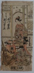 | 鳥居清満(1735〜1785)二代目鳥居清倍の門人。作画期は延享から明和のころにかけてで役者絵、美人画を、また青本、黄表紙など草双紙の挿絵、番付絵、芝居看板絵、肉筆画、あぶな絵を描く。鳥居派の伝統的な画法を遵守した。紅摺絵に秀作がある。鳥居清広、鳥居清長、鳥居清経、鳥居清秀、鳥居清久、鳥居清近など最も多くの門人も育てており、鳥居家の隆盛を作った。「清満」の名は三代続いた。 |
