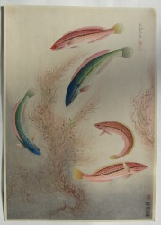 | 大野麦風/麥風(1888〜1976)東京出身。太平洋画会、白馬会等で洋画を学び、後に日本画に転向。明治42年、大正3年、同8年に文展や帝展に出品するほか、個展を度々開催して自作の展示を行なう。大正12年関東大震災を契機に関西に移住、昭和5年兵庫県美術家連盟の創設に参加。一方で、魚など水生生物の生態を緻密に描写した木版画集「大日本魚類画集」の原画制作も手掛ける。 |