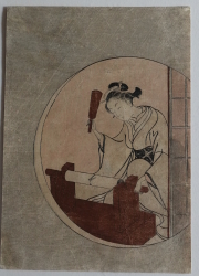 鈴木春信(1725〜1770)細身で可憐、繊細な表情の美人画で人気を博し、木版多色摺りの錦絵誕生に決定的な役割を果たした。礒田湖龍斎や司馬江漢等に強い影響を与え後の浮世絵の発展に多大な力を及ぼした。