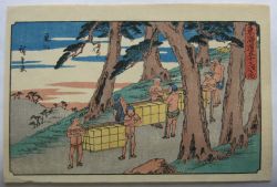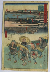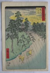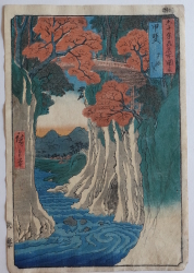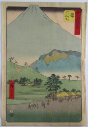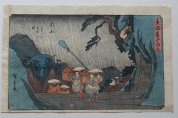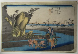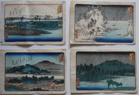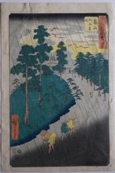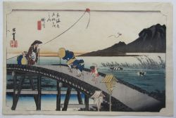 | 歌川広重(1797〜1858)安藤広重。江戸出身。幕府定火消同心の子として生まれる。歌川豊広に入門。広重は1831年頃から『東都名所』など風景画を手がけるようになり、1833年『保永堂版東海道五十三次』により風景画の広重として名声を高める。『名所江戸百景』、広重、英泉との合作『木曾街道六十九次』が有名。二代広重、三代広重など高弟を育てた。後年、橋口五葉が東海道五十三次の複製を監修したり、ゴッホが模写をしノエル・ヌエット、アンリ・リヴィエールなど外国人にも収集を通じ影響を与え古今東西世界的に影響力のある作家と言える。明治の広重(小林清親)大正の広重(吉田初三郎)昭和の広重(川瀬巴水) |