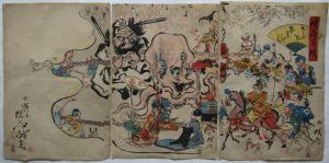| 河鍋暁斎(1831〜1889)茨城県出身。日本画家の暁翠は暁斎の娘。次男、暁雲も浮世絵を描くなど育成にも力を持つ。幕末から明治にかけて活躍する。歌川国芳に入門するも、狩野派も学ぶ。浮世絵だけではなく、むしろ日本画に強い傾倒を受け内外から日本画家として高い評価を受ける。 |