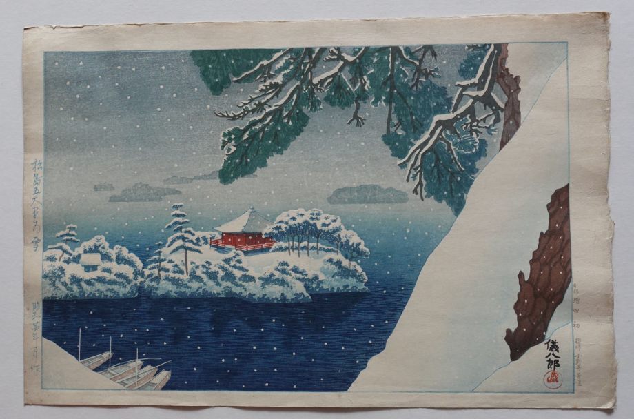 | 奥山儀八郎(1907〜1981)山形県寒河江町(現・寒河江市)生まれ。幼少より木版画に親しみ、1928年に日本創作版画協会展で初入選。同年より日本毛織宣伝部の広告作家として活躍し、後に大高重治とともにニッカウヰスキーのポスターやラベルを木版で制作した。1936年に石井研堂に師事し伝統技法を研鑽。戦後は日本版画研究所を運営し、彫師・摺師との分業による新版画制作に取り組む。1954年以降は松戸に工房を構え、身近な風景を題材に制作を続けた。1981年没。 |