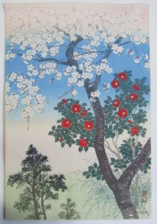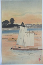 | 川面義雄(根来莱山)(1880〜1963)大分県出身。東京美術学校卒。名品の復刻模写にたずさわる。昭和17年から38年にかけて,徳川黎明会本「源氏物語」の着彩木版複製を制作完成。28年文化財保護委員会の技術保持者にえらばれる。現代における複製木版技術の第一人者で、精妙細緻な技術を大成し、昭和34年10月紫綬褒賞を授与されている。根来莱山の名で木版画集 東都十景を制作、海外で新版画の作家としても高い評価を受ける。 |