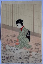 | 小村雪岱(1887〜1940)明治37年(1904年)、東京美術学校日本画科選科入学。下村観山教室にて古画の模写、風俗考証を学ぶ。在学中に泉鏡花に出会い、雪岱の雅号を与えられる。大正3年(1914年)、泉鏡花の『日本橋』の装幀を行ない、以後多くの鏡花作品を装幀、木版多色摺りによる挿絵の仕事を手がける。画風は鈴木春信の影響をベースにしつつ、幕末の退廃的な浮世絵、近代の日本画、デザインを取り入れ独特な世界感を生み出す。 |