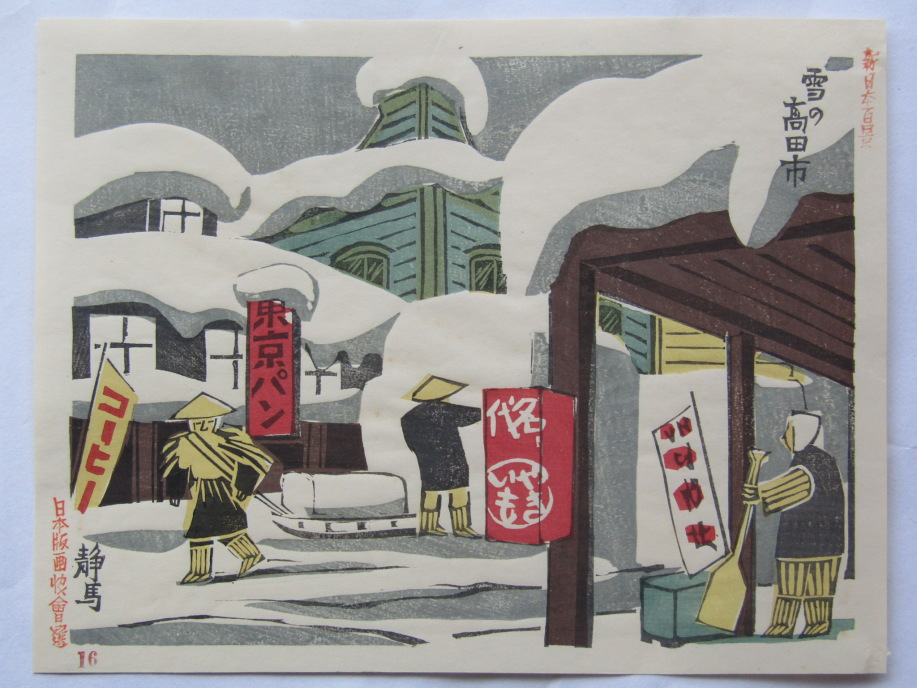 | 内田静馬(1906〜2000年)埼玉県川田谷村(現・桶川市)生れ、旧制川越中(現・川越高校)から東京高等工芸学校(現・千葉大学)卒業。1928年第6回春陽会展入選を機に版画家として歩み始める。1934年「海水浴場」パリ国立図書館買上。 以降ジュネーブ・マドリッド・サンフランシスコ・ロスアンゼルス・ニューヨークなどの海外展に多数出品。 1939年新日本百景に「雪の高田市」配布。2005年川越市立美術館による顕彰から再評価される。 |