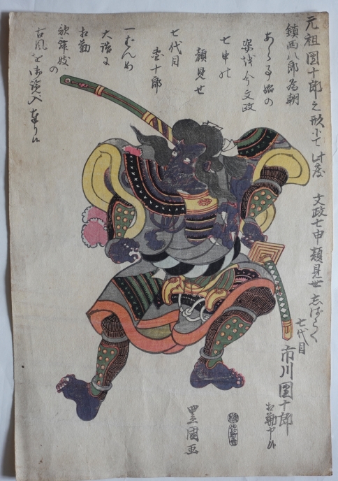 | 歌川豊国1769〜1825、歌川豊春に入門。役者絵、美人画を得意とする。特に役者絵の大顔シリーズは今日でも高い評価を得ている。国貞(三代豊国)、二代豊国、国芳など数多くの弟子を育てる。 |