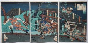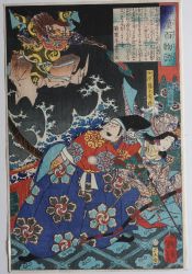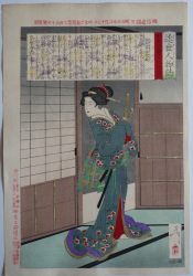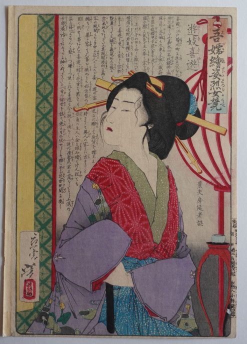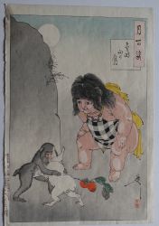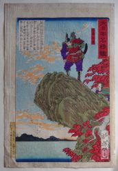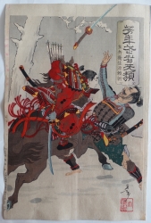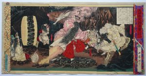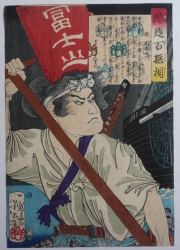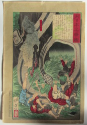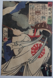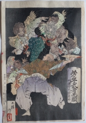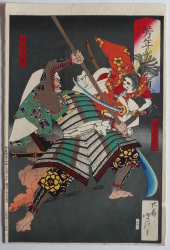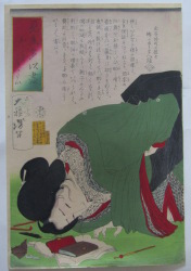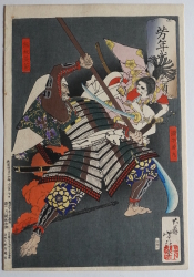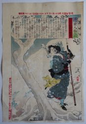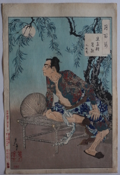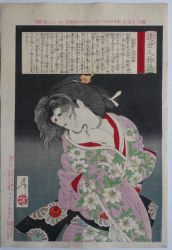 | 月岡芳年(1839~1892)姓は吉岡、のち月岡雪斎の養子となる。国芳門人。はじめは、役者絵や武者絵を描き、芳幾との合作「英名二十八衆句」や「魁題百撰相」などの血みどろ絵、無残絵で人気を博す。明治6年に強度の神経衰弱になる。そのころから従来の浮世絵に危機感をもち後年、門下生には日本画家になるよう促す。芳年自身は最新の洋風画や歌川派とは異なる葛飾派、他派の日本画などを貪欲に研究し、独自なシリアスな画風を身につけるようになる。ある意味、ポピュリズムに囚われない芳年の内面性を表現した作品は以前にも増し人気を得、晩年は、「月百姿」「風俗三十二相」「新形三十六怪撰」など連作、大作を作成する。特に得意とした人物画は、シャープかつ柔らかい線描、立体感のある画面構成を特徴としたものとなり従来の紋切り型の浮世絵とは異なる表現で結果的には浮世絵の時代を延命をさせ、最期の浮世絵師として評価される一方で、近代日本画にも多大なる影響を与えた。例えのひとつとして憂いのある美人画は、後に、水野年方から鏑木清方、伊東深水、池田輝方、へと受け継がれるようになり近代美人画の祖とも言える。海外でも評価は非常に高く「Beauty & violence」と題されて各地の美術館で紹介された。このような表題はいみじくも芳年の画風がどの時期においても高く評価されてると事が伺え稀有な絵師ともいえる。芳年54歳、2度目の発病で没した。芳年の門人には山中古洞、水野年方、稲野年恒、右田年英、山崎年信、山田年忠らがいる。 |